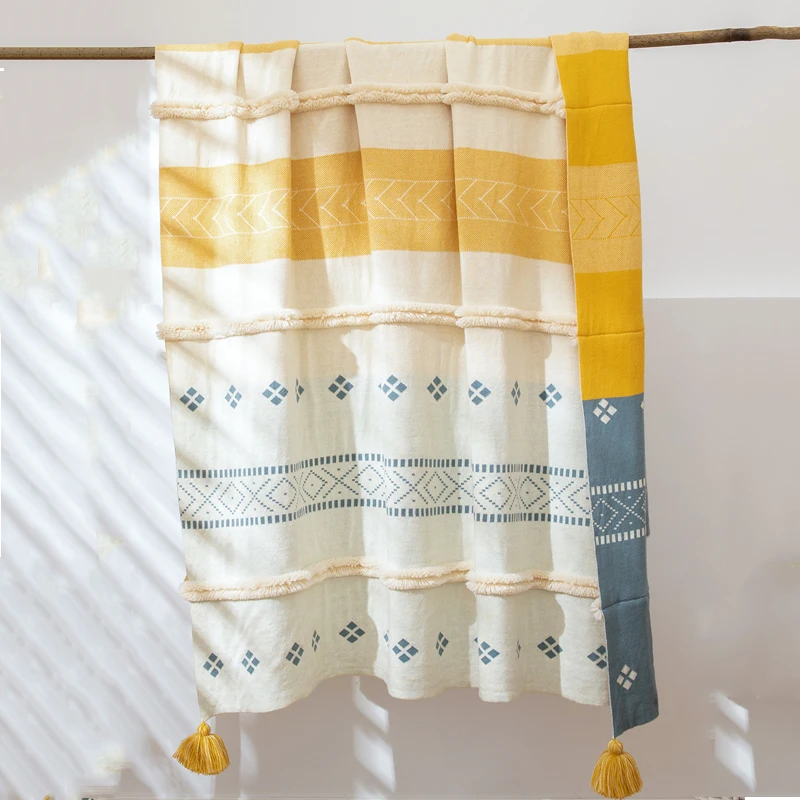 Product Name: 綿毛布ソファニットスローブランケットtassles黄色グレー旅行毛布130 × 170センチメートルホームソファベッド51 "x 67"